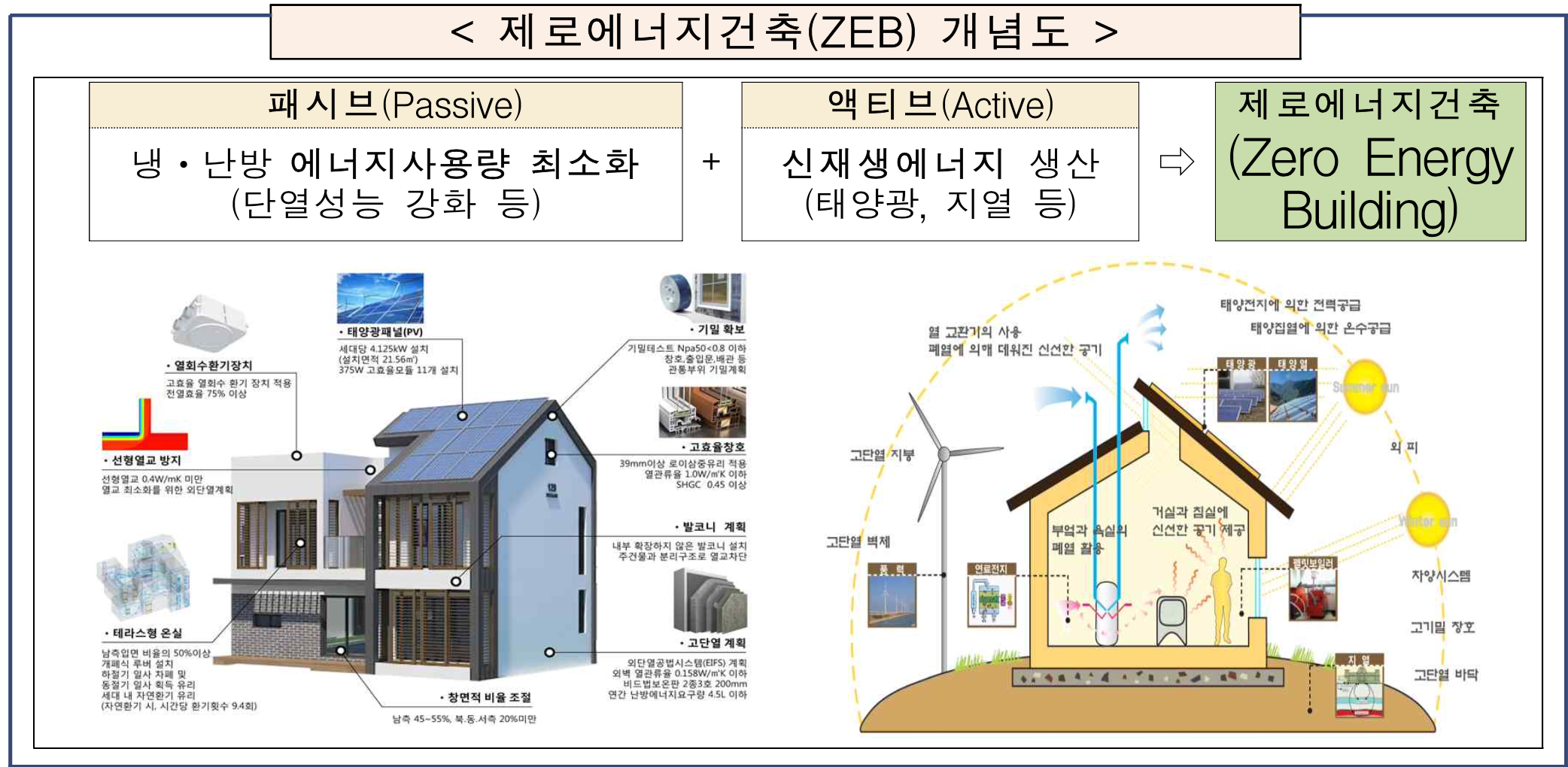 제로에너지 건축물 ZEB(Zero Energy Building)란 건축물에 필요한 에너지부하를 최소화(패시브)하고,